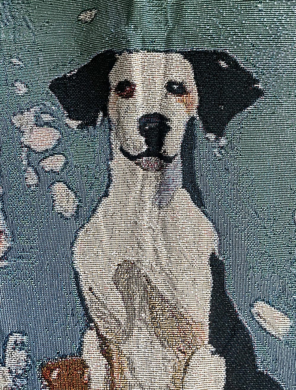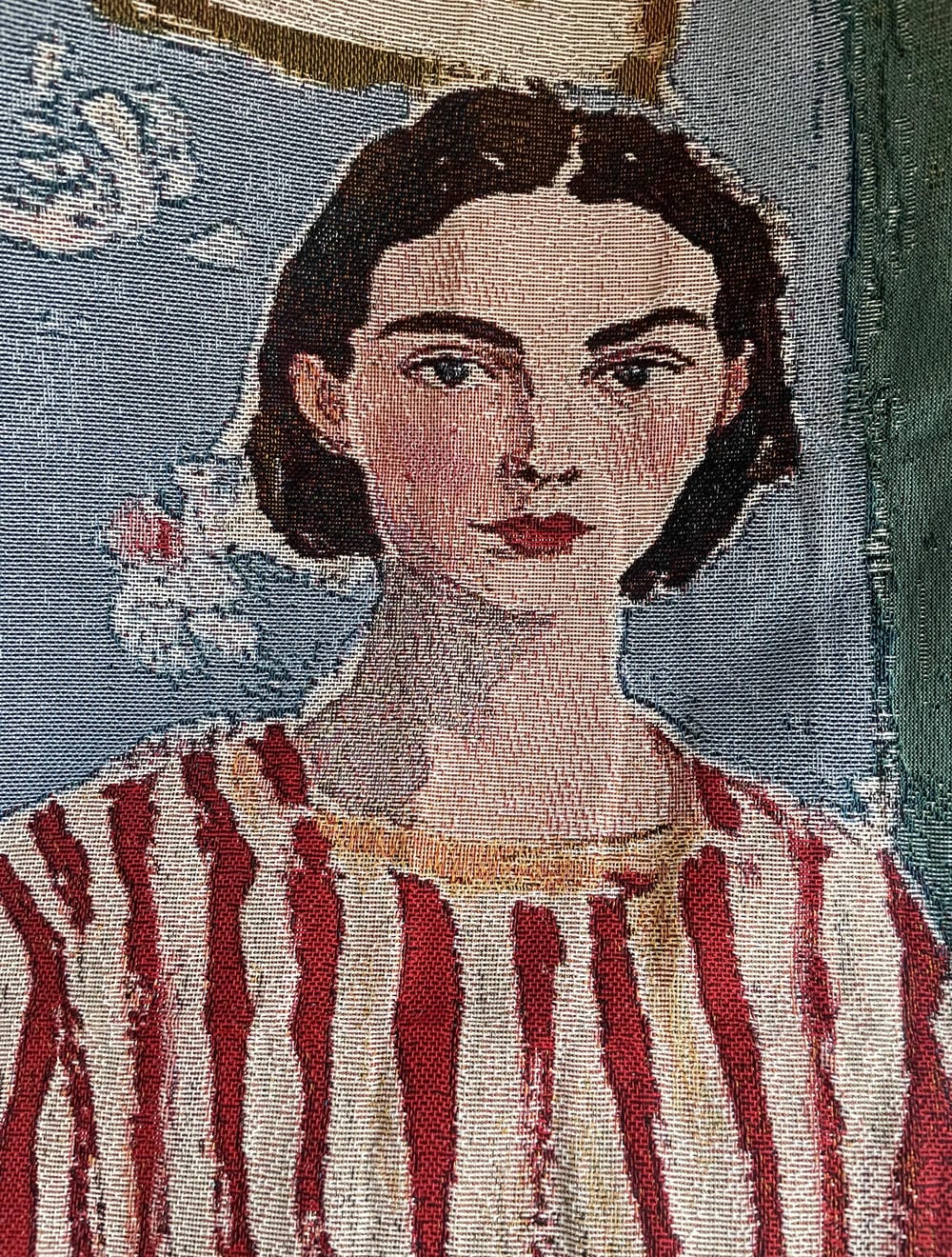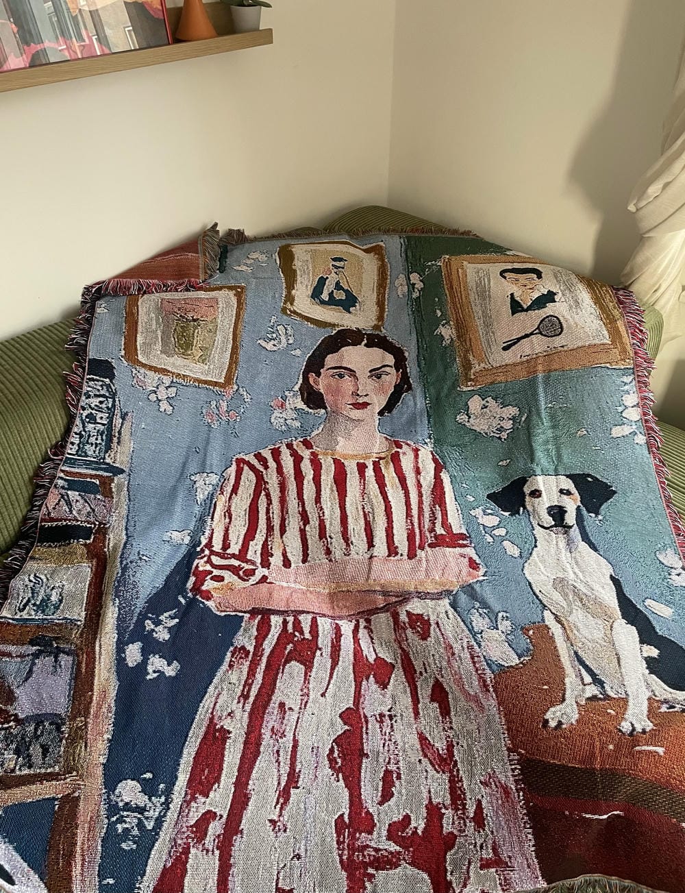 Decorative polyester wall tapestry featuring an artistic illustration of a woman and a dog in an interior setting. The woman wears a red and white striped dress and stands beside a seated dog, with framed artwork and soft decorative elements in the background.