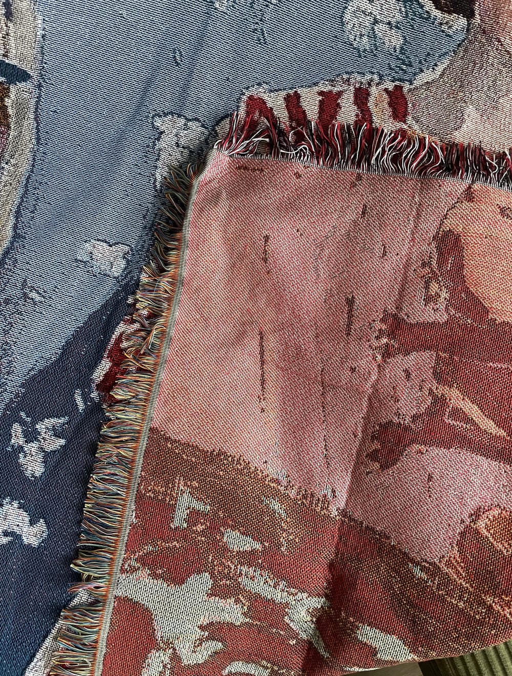 Suitable as a wall hanging, bedspread, or sofa throw. Complements vintage, eclectic, and art-inspired interiors.